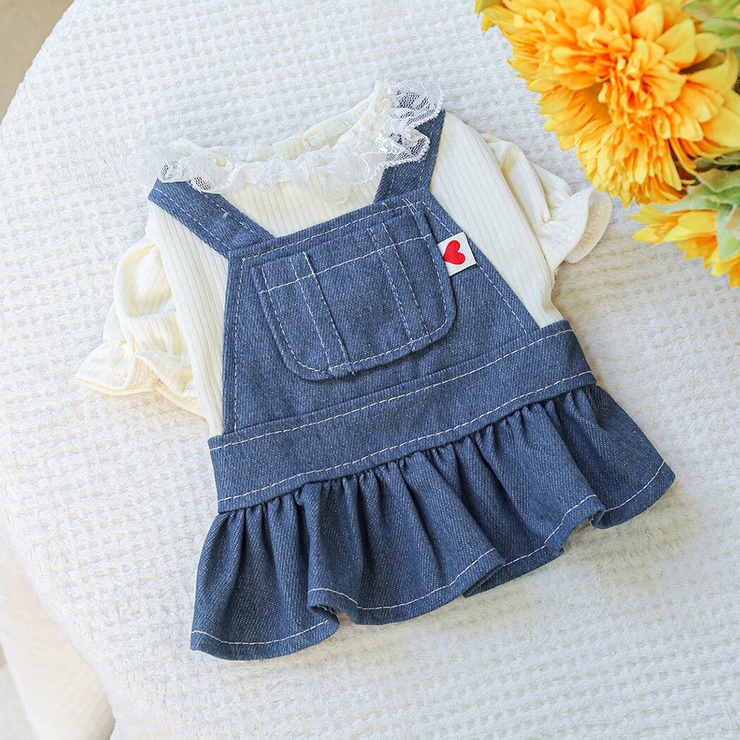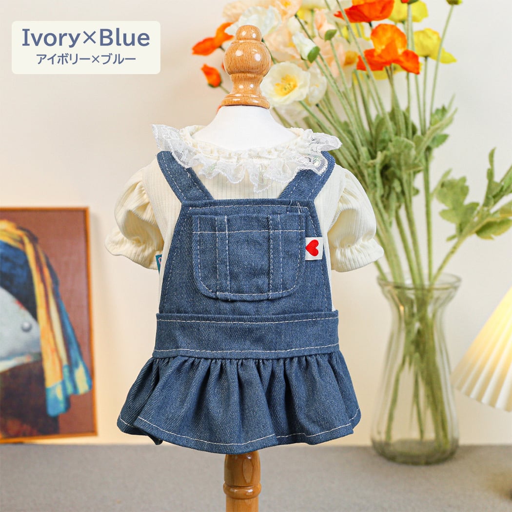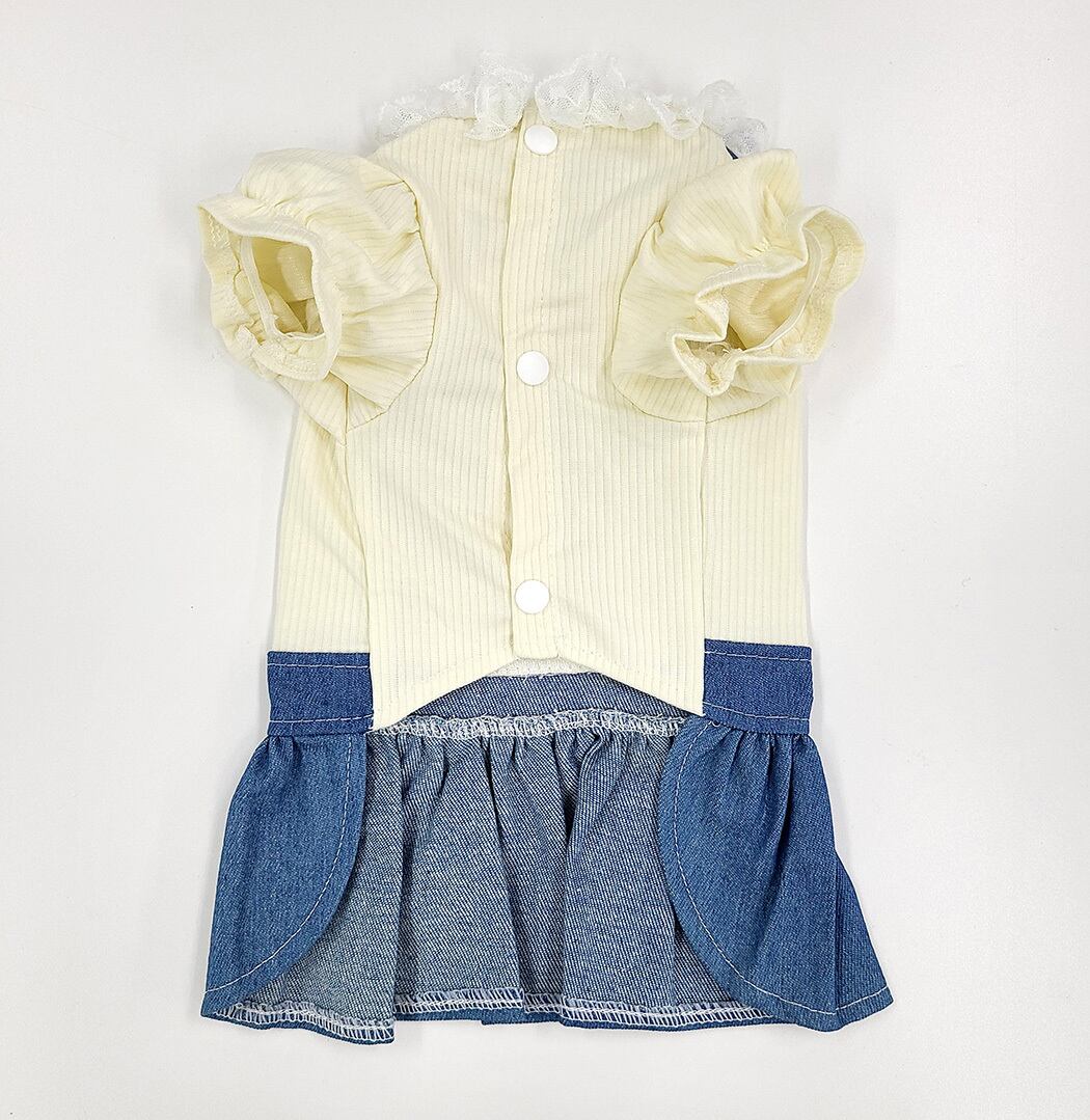リブ生地トップス×デニムジャンパースカートのレイヤード風デザインがオシャレなドッグウェア!